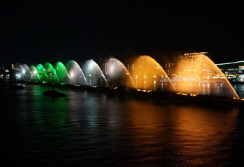 琵琶湖のシンボルとして親しまれる「びわこ花噴水」は、大津港の沖合から勢いよく水が舞い上がるダイナミックな噴水です。