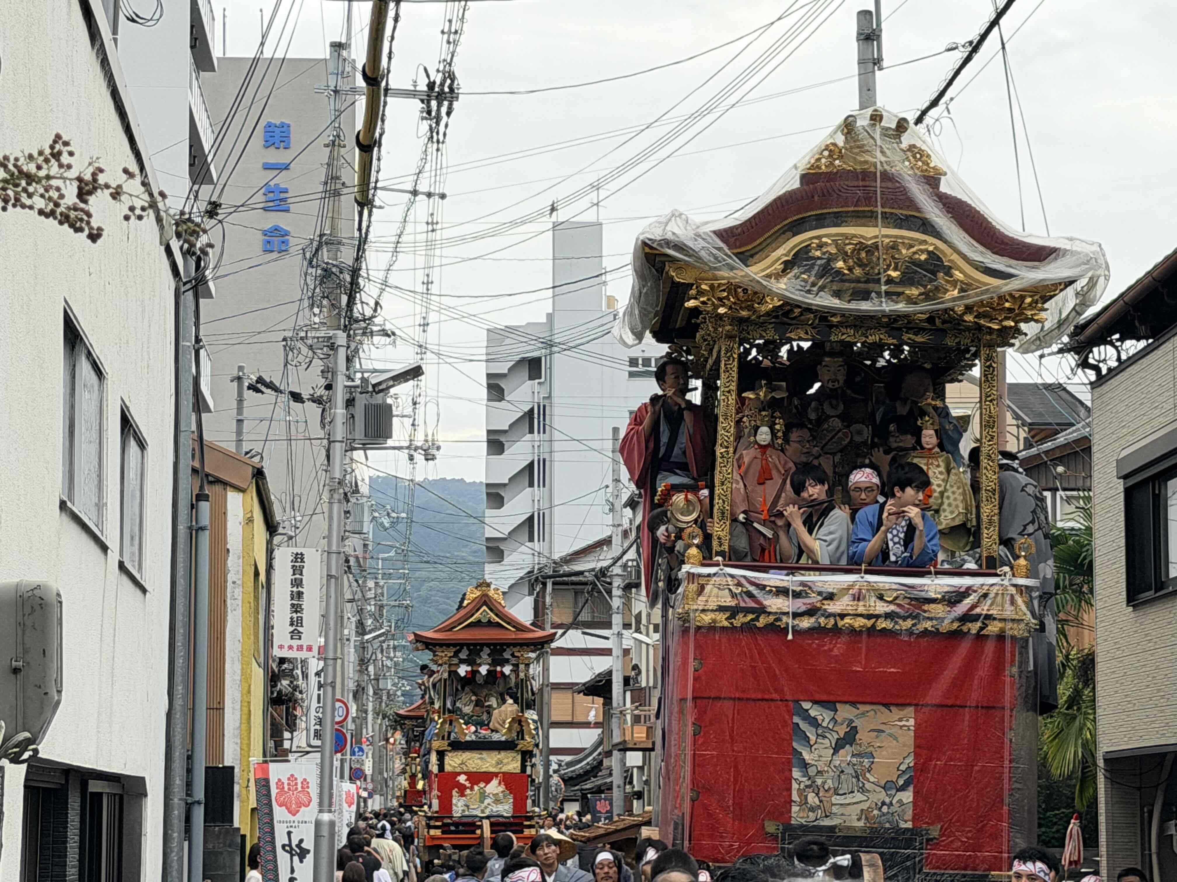 琵琶湖の西南に位置する大津市で、湖国三大祭のひとつ、国指定重要無形民俗文化財の『大津祭』が行われます。京都祇園祭の風情を色濃く継承した祭礼。現在13基ある曳山はいずれも江戸時代に制作されたもので、各曳山にはからくり人形が乗っているのが特徴です。祭礼1週間前に組み立て、本祭の翌日に解体されてしまいます。