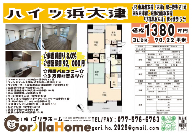 価格もお手頃で、浜大津徒歩5分、大津駅までも歩けないこともない。