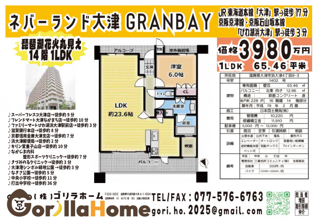 【価格変更】ネバーランド大津GRANBAY 14階|琵琶湖花火大会眺望|1LDK・65.46㎡|3980万円