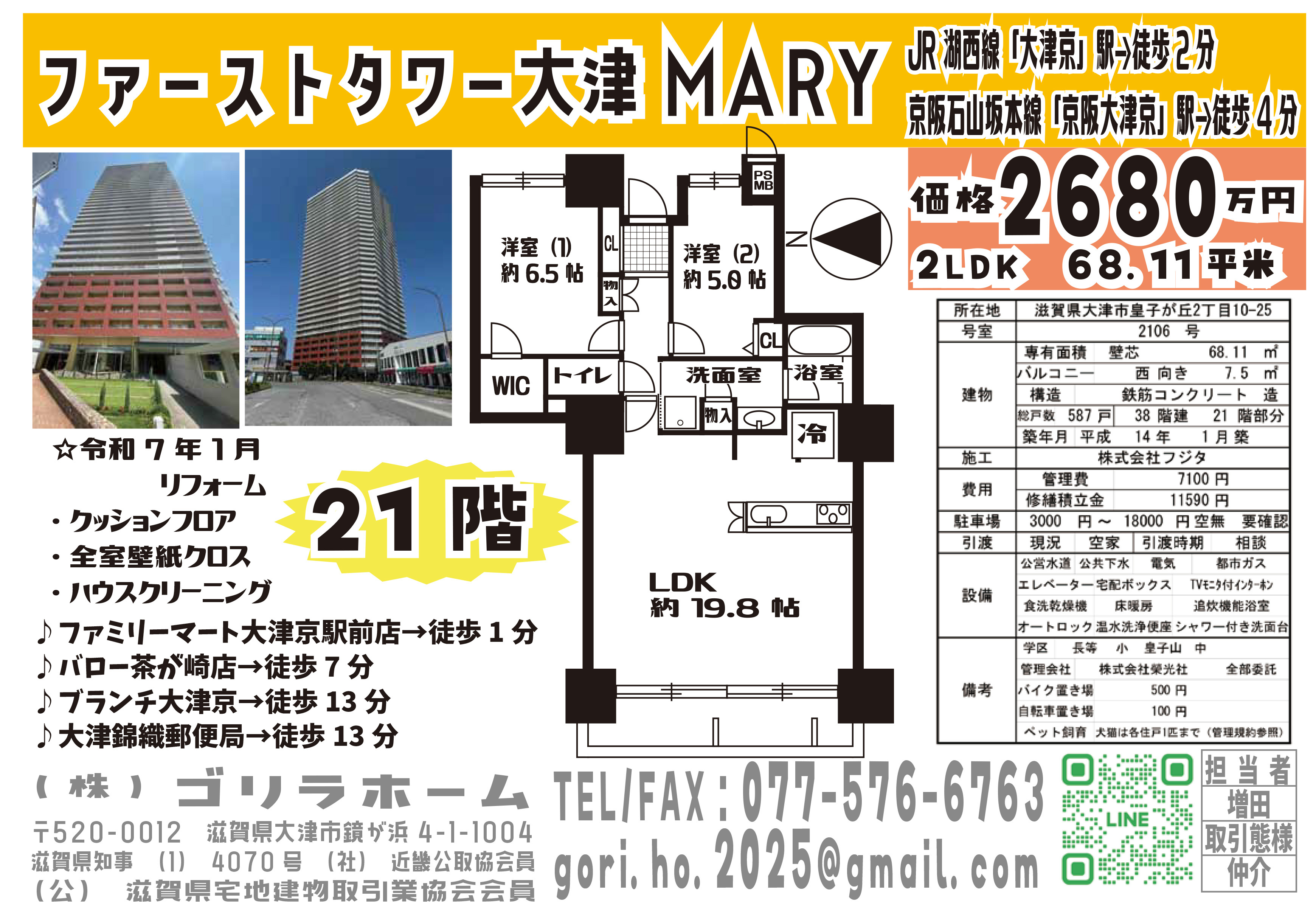 建物名 / 物件名 | ファーストタワー大津MARY 2106号室 |