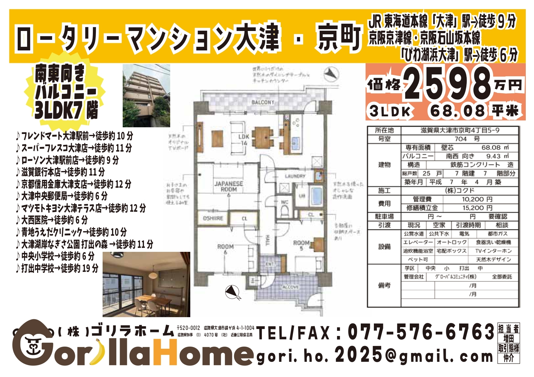 | 築年数 | 築21年~30年 | 建物面積 | 専有面積: 68.08㎡ バルコニー: 9.43㎡ |