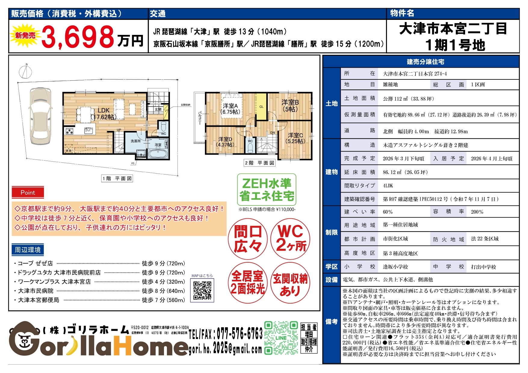 | 築年数 | 新築 | 建物面積 | 土地:112.00㎡(33.88坪) 建物:延床面積86.12㎡(26.05坪) 仮測量面積 有効宅地部分:89.66㎡(27.12坪) 道路後退部分:26.39㎡(7.98坪) |