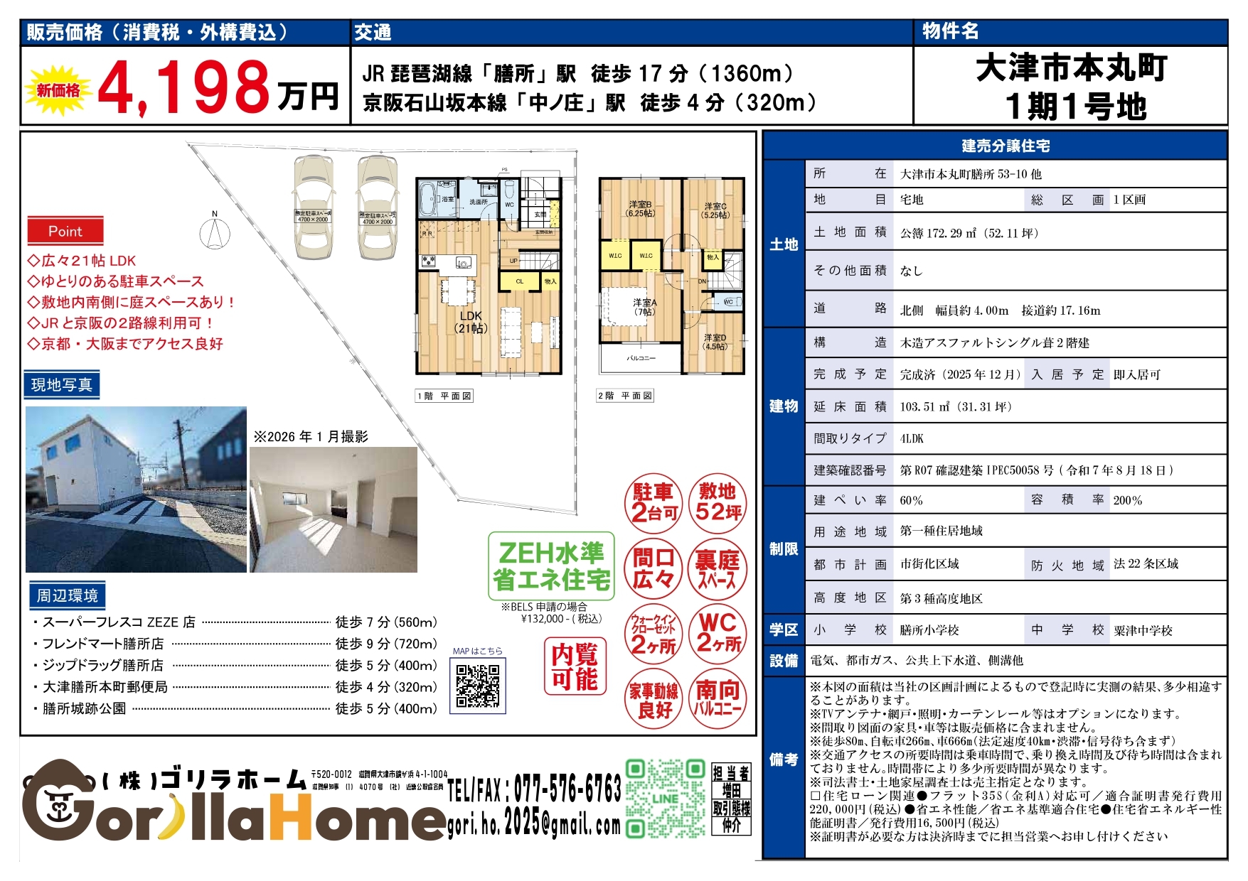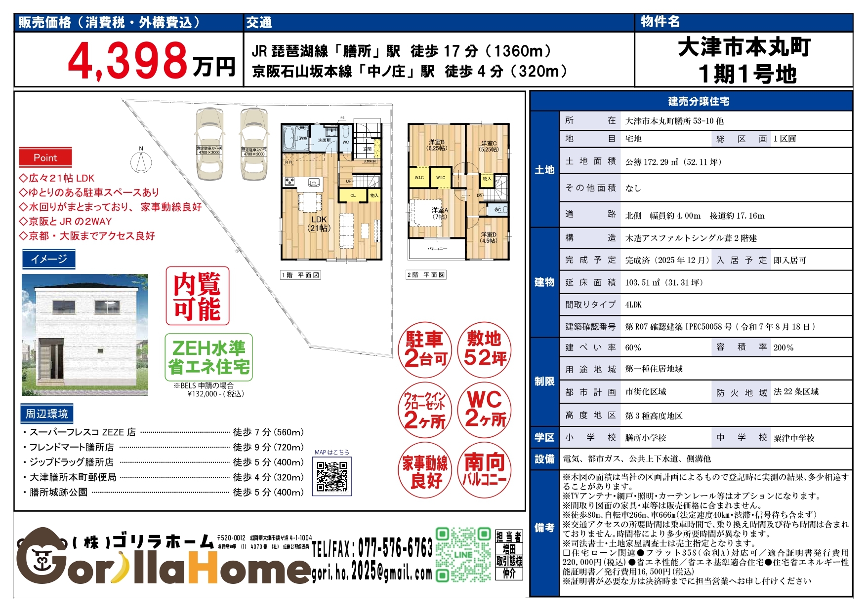 | 築年数 | 新築 | 建物面積 | 土地:172.29㎡(52.11坪) 建物:延床面積103.51㎡(31.31坪) |