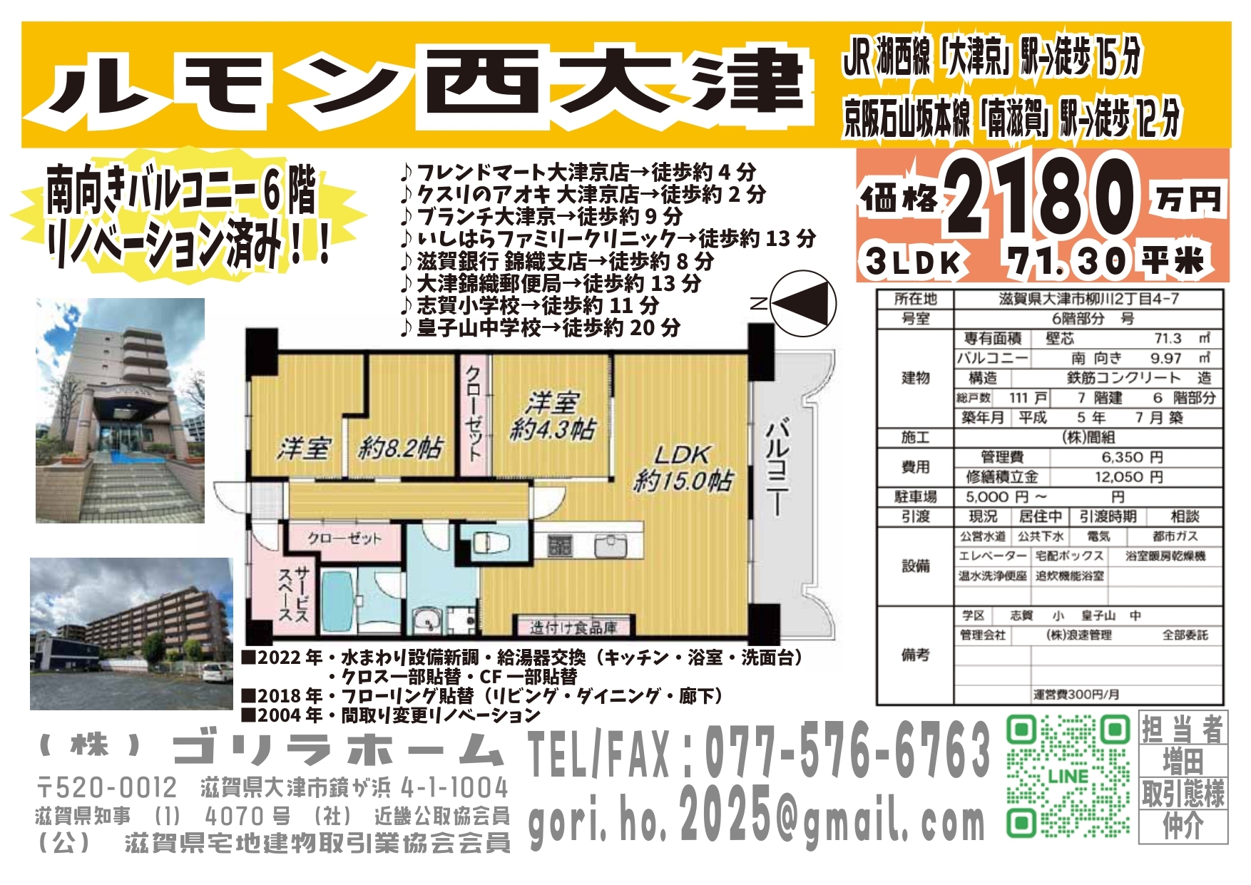 | 交通 | JR湖西線「大津京」駅 (徒歩15分) 京阪石山坂本線「南滋賀」駅 (徒歩12分) |