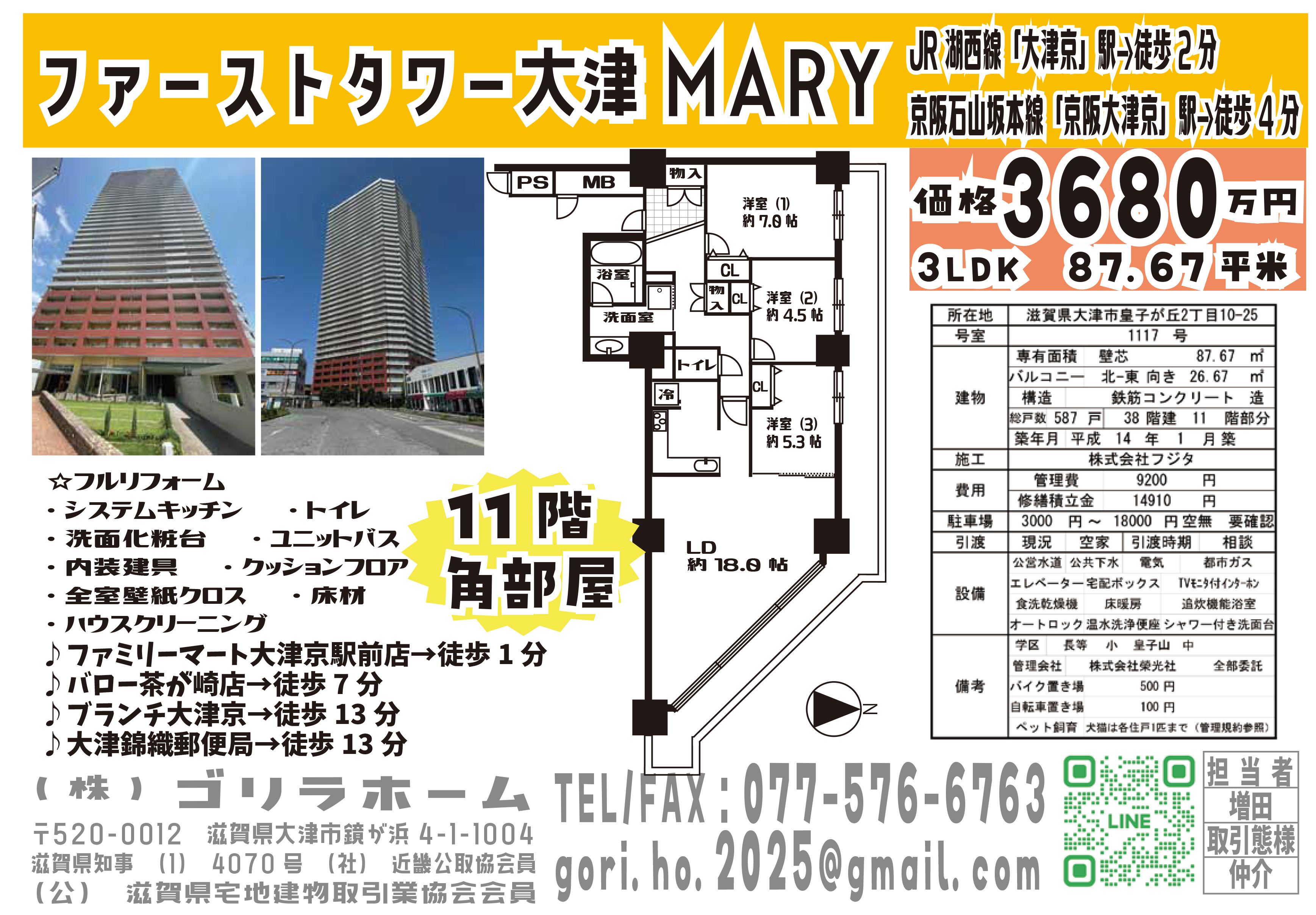 建物名 / 物件名 | ファーストタワー大津MARY 1117号室 |